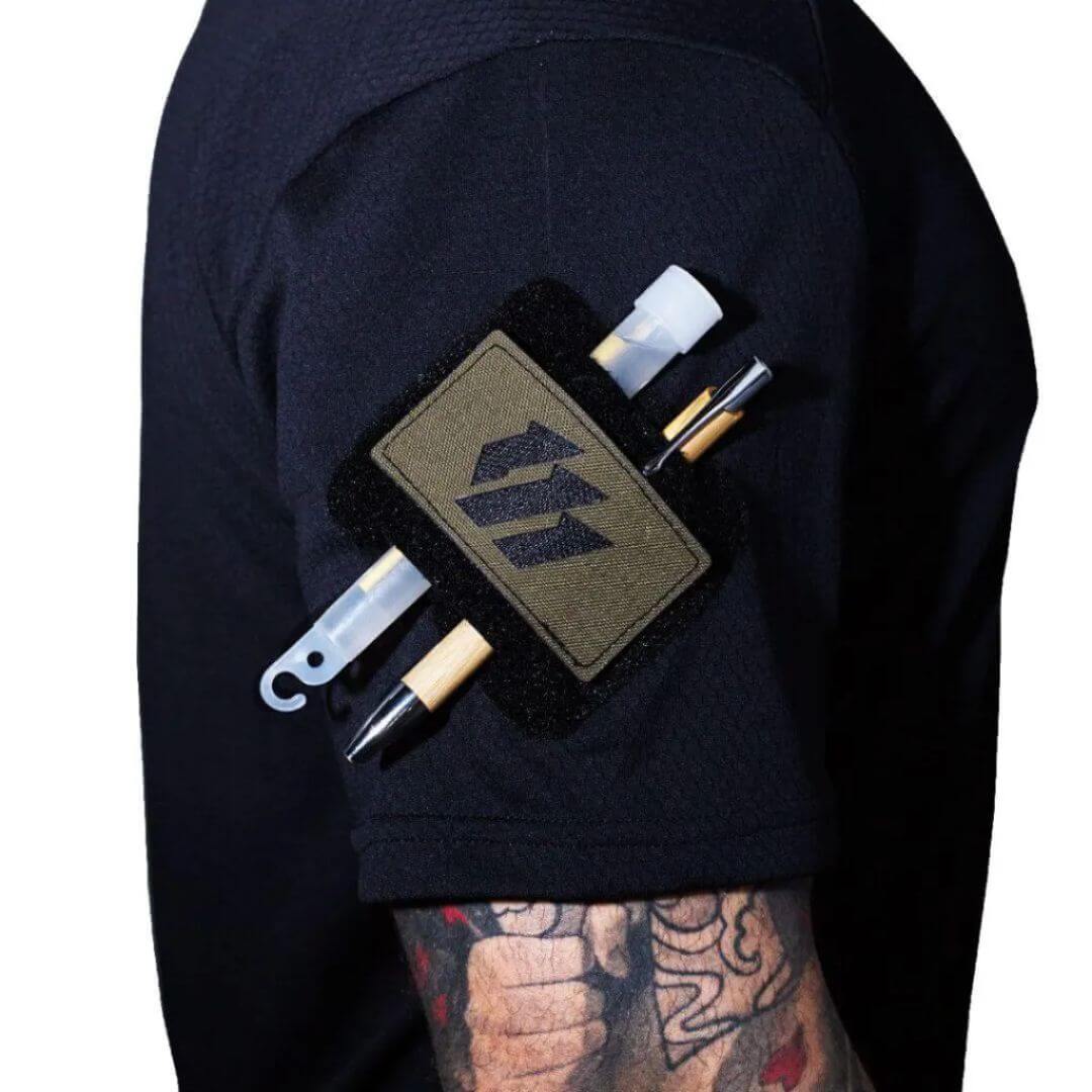 Inserimos 3 velcros fêmea, 1 localizado nas costas para patch e V-Light e 2 angulados localizados nos braços para atender melhor aos contornos, além de contar com 2 compartimentos para canetas ou cyalumens, junto ao patch que desejar.
