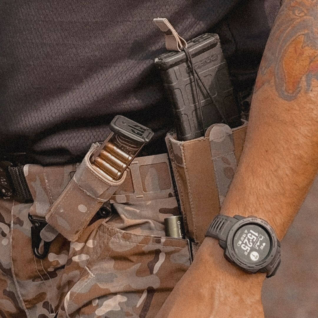 - Retenção Dual: Conta com dois sistemas de retenção – passiva e ativa. A camada elástica especial mantém o carregador firmemente no lugar, enquanto o elástico superior garante segurança adicional, mesmo em combates corpo a corpo.